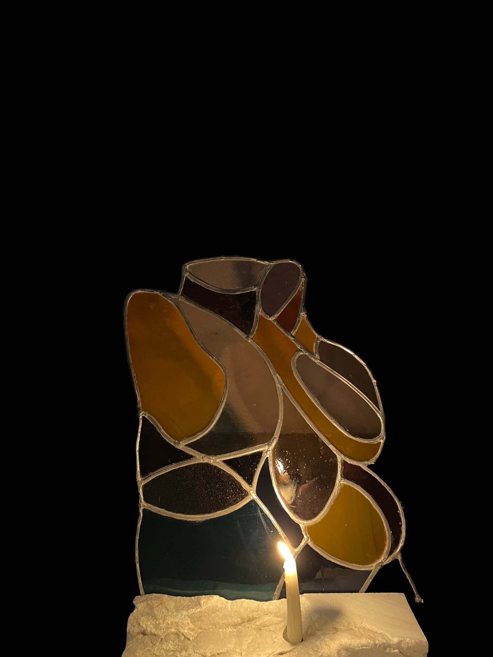 Ausformung nackter männlicher Körper anhand sakraler Glaselemente.