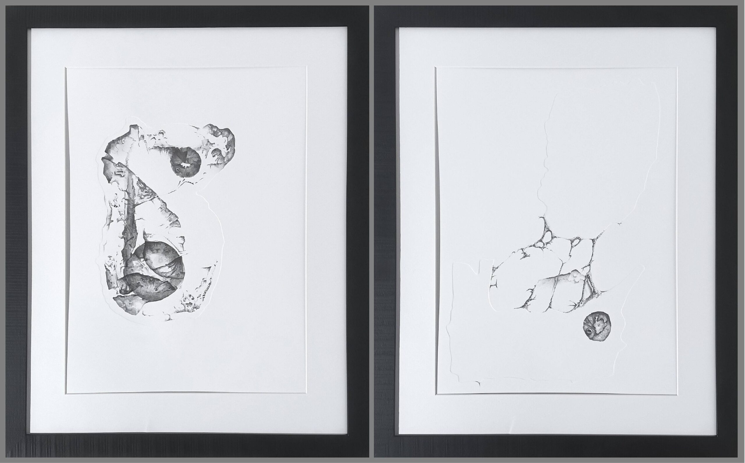 Die Arbeit „Quantum Xylem“ beschäftigt sich zeichnerisch mit einer topografischen Reinterpretation verschiedener Wespennester. Die Strukturen fügen sich dabei zwischen stempelartigen Vertiefungen des Papieres ein.
