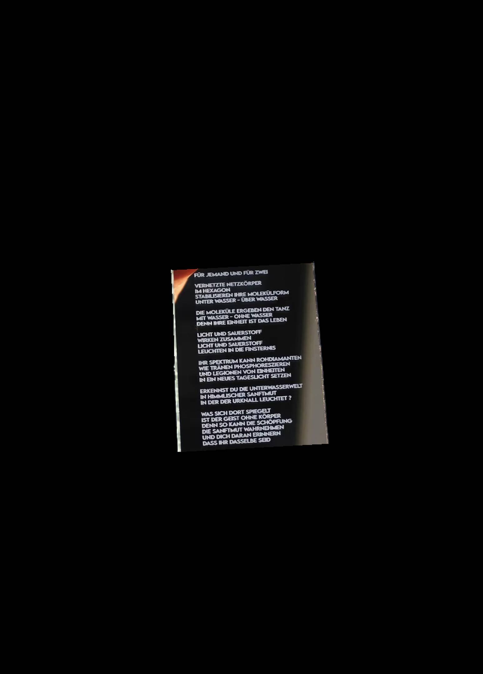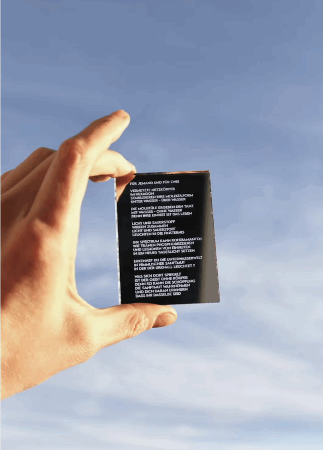 Das beschriftete Spiegelglas in der Größe einer Kreditkarte agiert als tragbares Kunstwerk und gleichzeitig als Gedicht. Die Schrift wird erst richtig lesbar, wenn sie gegen eine Lichtquelle gehalten wird. Das Kunstwerk kann überall mit hingenommen, installiert und vorgelesen werden. In dem Moment, in dem es verkauft wird, geht es auf eine Reise.