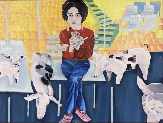Meine Freundin Cleo – im Schweinestall auf einer Bank, mit einem Dürum in der Hand.