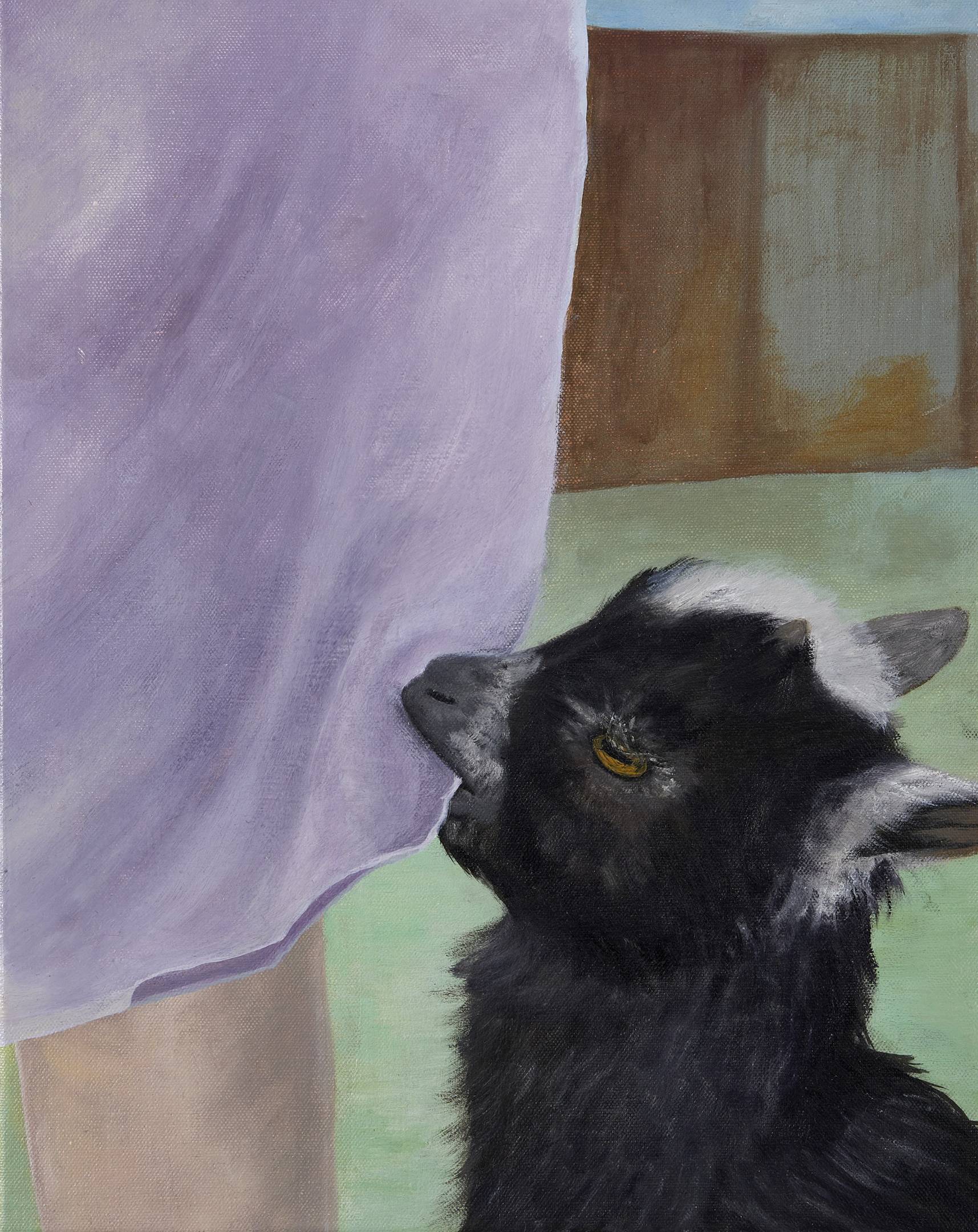 In diesem Werk verbinde ich die Zartheit eines jungen Ziegenbocks mit der Anmut einer weiblichen Figur. Auf den ersten Blick wirkt die Szene heiter und vertraut, fast spielerisch. Doch hinter der Oberfläche eröffnet sich eine subtile Spannung, die meine Auseinandersetzung mit der Verbindung von Schönheit und Unbehagen widerspiegelt. Wie in vielen meiner Arbeiten erforsche ich hier die Gegensätze zwischen Unschuld und gesellschaftlich geprägten Rollenbildern.